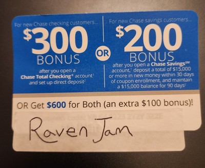 Chase $600 Checking + Savings Bonus (Available Online) Oct 09, 2022 · The Offer. Direct Link to offer (incognito). Chase is offering a checking & savings bonus worth up to $600. Bonus is as follows: Receive a bonus of $300 when you open a Chase Total checking account and have a direct deposit post to the account within 90 days.